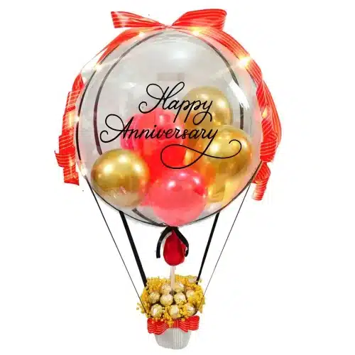 Make your anniversary truly unforgettable with this stunning hot air balloon-inspired gift! ✨ Featuring a crystal-clear bubble balloon filled with elegant gold and red mini balloons, accented with glowing lights, luxurious red ribbons, and a charming base adorned with Ferrero Rocher chocolates and golden flowers. 🍫🎀