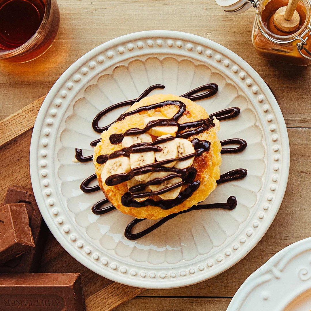 Signature Ensaymada topped with fresh bananas and a drizzle of our homemade chocolate sauce.