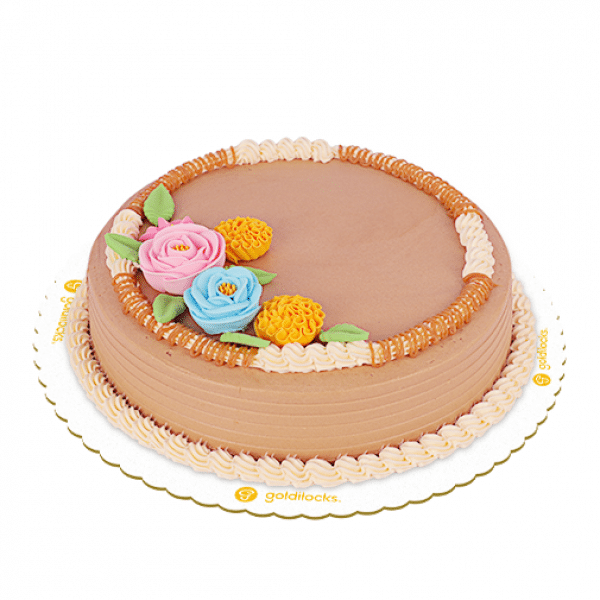 Vanilla chiffon cake filled and iced with caramel buttercreme decorated with vanilla cream and topped with pastel blooms.