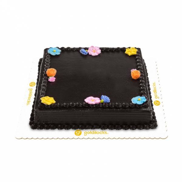 Choco chiffon cake filled and iced with chocolate frosting topped with colorful blooms