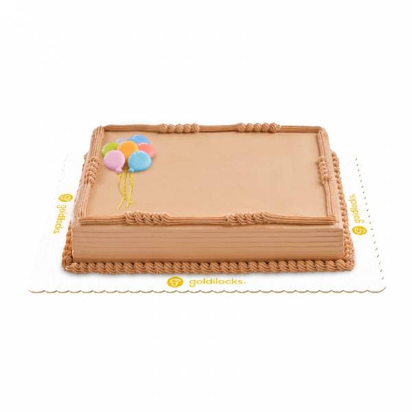 Mocha chiffon cake filled and iced with mocha buttercreme icing topped with colorful balloons.