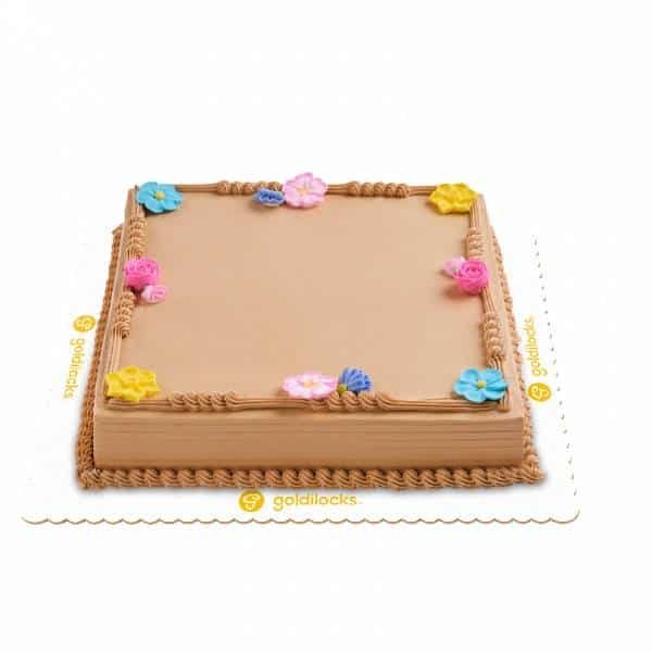 Mocha chiffon cake filled and iced with mocha buttercreme icing topped with colorful blooms.