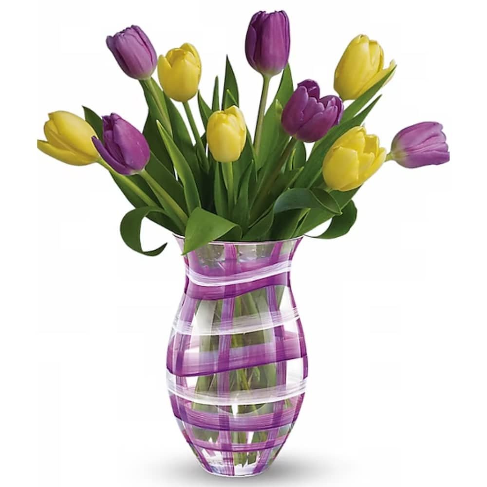Tulips represent love, happiness, and new beginnings, making them the perfect gift for any occasion. We have selected lavender and yellow to make a cheerful spring. Note: Clear vase only.