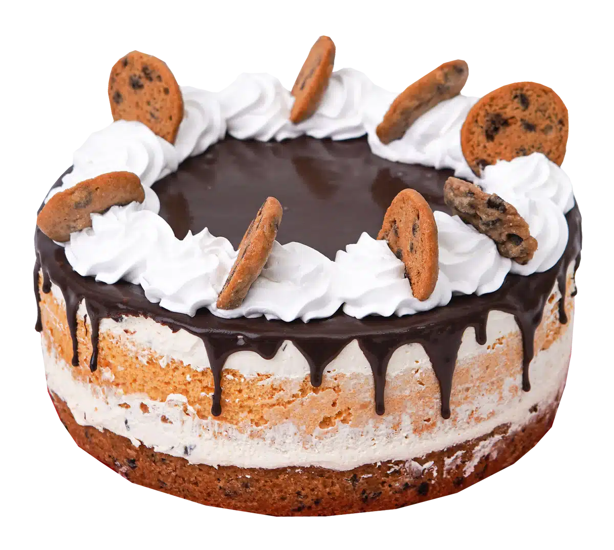 Enjoy our Milk and Chocolate Chip Cookie Cream Cake, featuring a baked chocolate chip cookie base, creamy milk mousse with chocolate chips, and a moist sponge cake soaked in a milk mixture. It’s topped with smooth chocolate ganache, fluffy whipped cream, and mini chocolate chip cookies. This cake is a perfect blend of classic flavors that will delight with every bite.