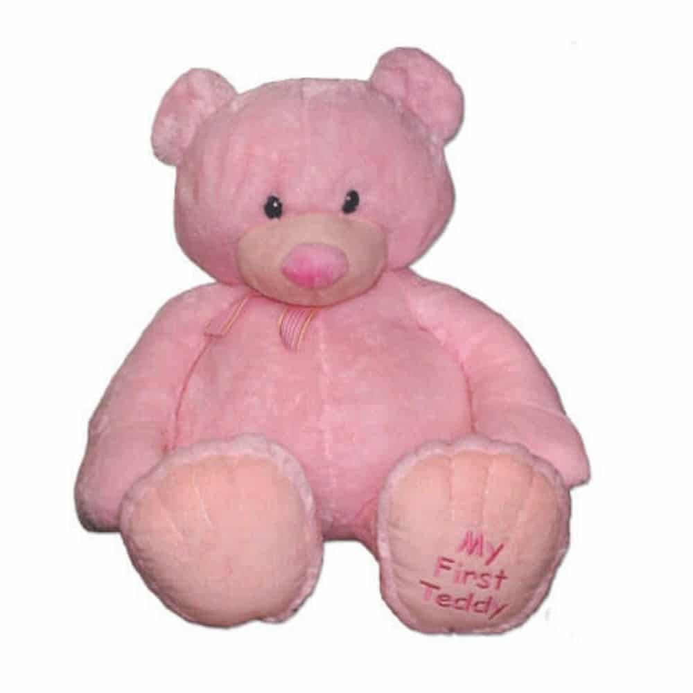 Charm a baby or child with this pink approx two and half feet plush teddy bear whose bottom right paw reads, “My First Teddy.”is not included. Teddy bears soothe and comfort babies better than practically any other stuffed animal! This huge teddy bear is specifically designed for a newborn but is a nice gift for almost any age. Her coat is pastel pink and is fluffier than a cloud; she is made from soft, comforting textures to appeal to a baby’s sense of touch. My First Teddy wears a pink ribbon with gold trim around her neck and has embroidered black eyes. My First Teddy is the perfect teddy for a baby girl and also looks fantastic as nursery decor (birth and up).