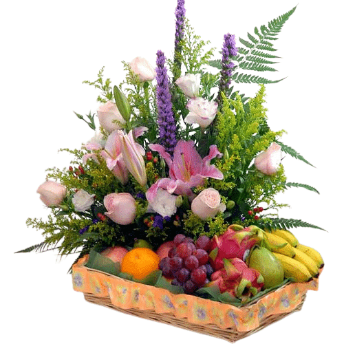 Get your loved ones in tip top condition with this basket of assorted fruits and a side floral arrangement of pink lilies and roses -the very ingredients for a pinky health.