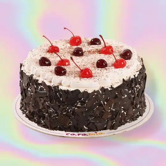 Rich chocolate chiffon and mousse with cherry jam, coffee filling, a hint of rum, topped with Italian dark amaretto cherries