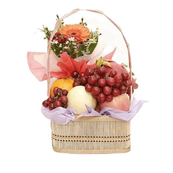 Representing a happy household of warmth and joy, this basket with fruits and a small bouquet brings out the sweetness of close relationships.